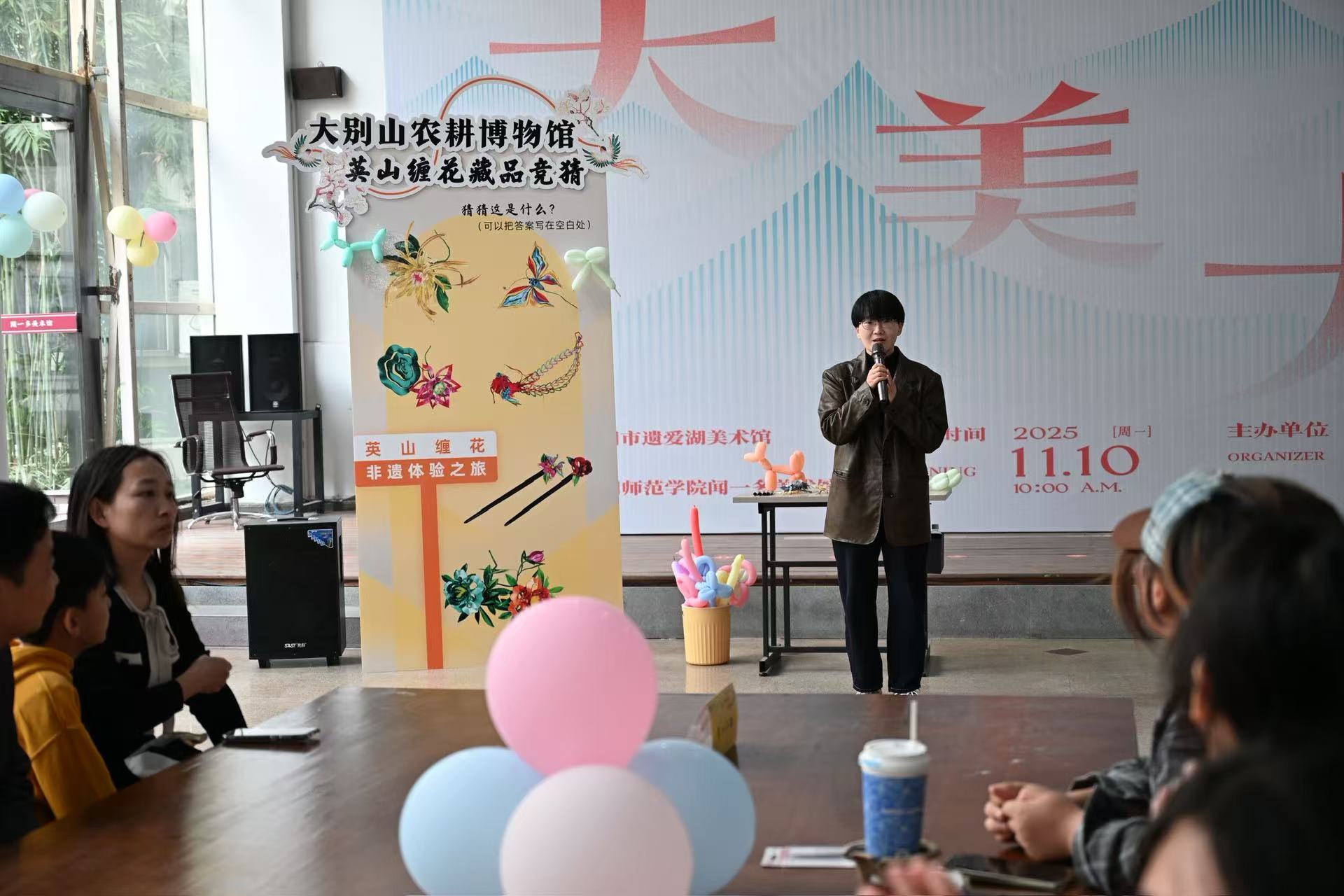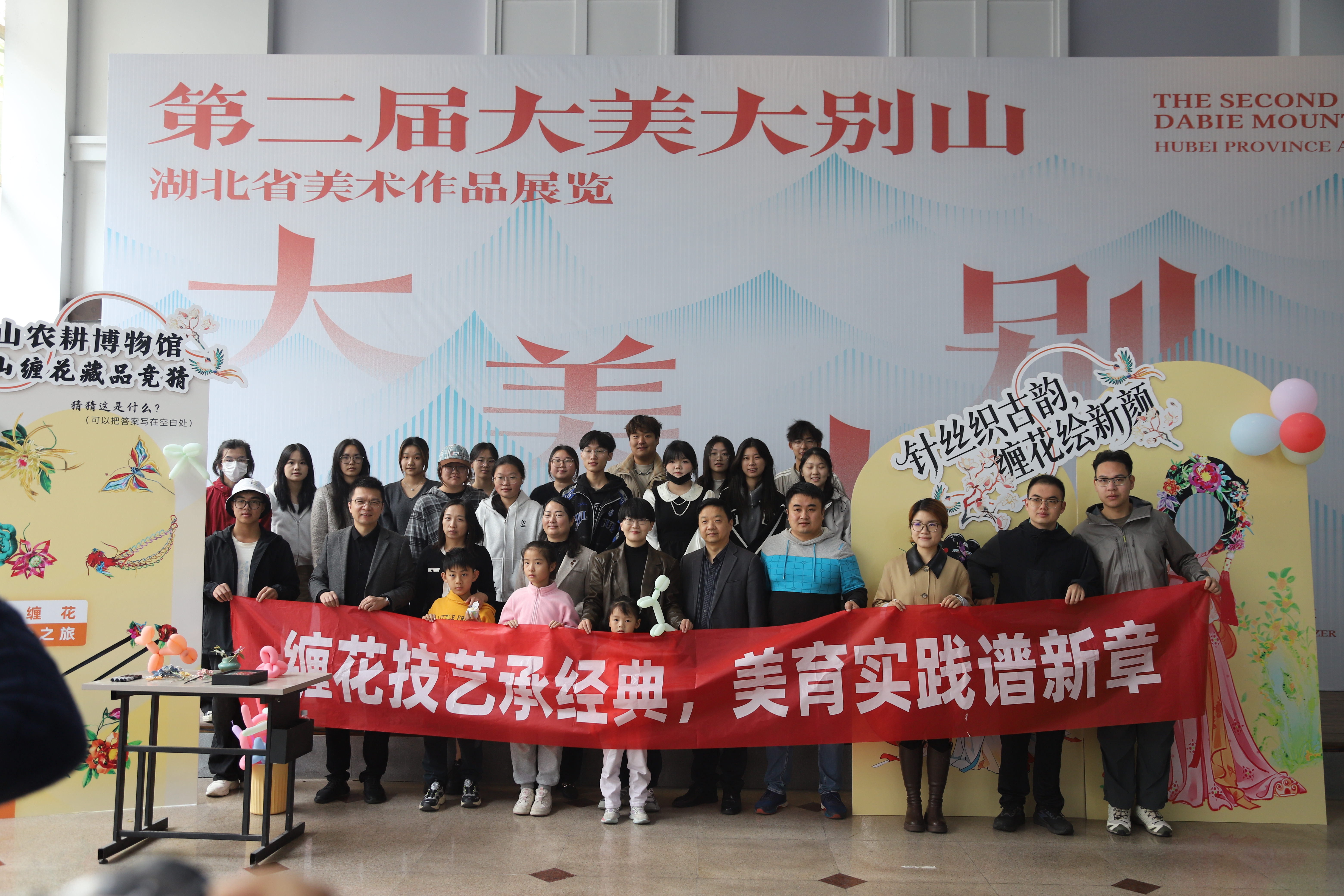 校团委书记陶莎、美术学院党委副书记杨波、商学院党委副书记李传坤、生物与农业资源学院党委副书记李燕、李时珍中医药学院副院长王书珍,以及辅导员、学生代表齐聚一堂,在穿引绳线中触摸非遗温度,让千年缠花技艺在校园焕发新生。