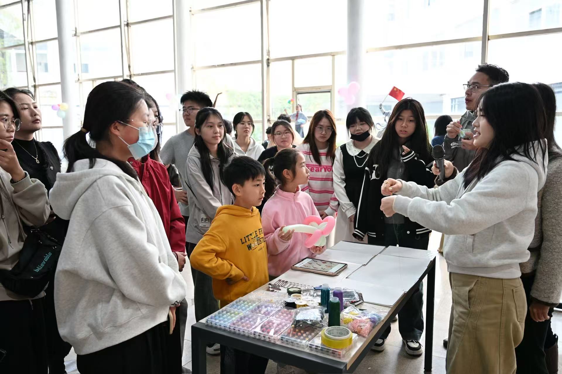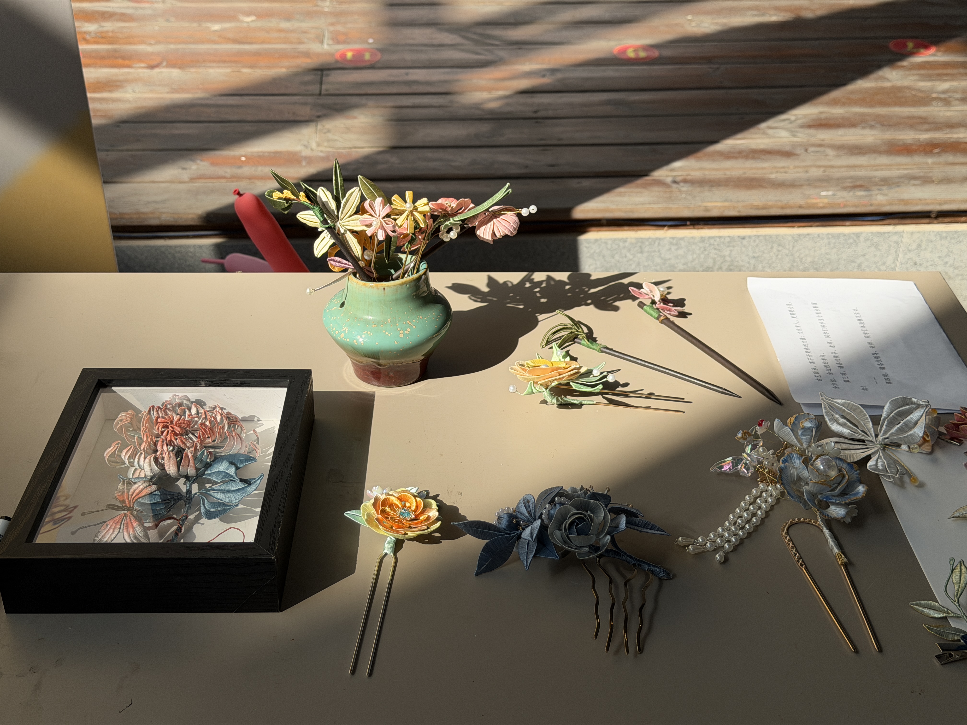 活动现场气氛热烈而融洽,科普区展示着缠花历史渊源、艺术特色及制作流程,打卡台的古风背景板前不时有师生驻足拍照,制作台上整齐摆放着彩色丝线、铜丝骨架与剪刀等工具。技艺教学环节,指导老师指尖翻飞,现场演示“绕线、打底、塑形、组合”的核心步骤,丝线在铜丝骨架上缠绕出流畅弧线;创意实践时,师生分组围坐,或专注复刻经典纹样,或低声交流配色巧思,丝线在指间穿梭的簌簌声与偶尔的惊叹声交织成动人的非遗协奏曲。“原来看似简单的缠绕,讲究的是手腕力度与排线角度的完美配合。”一位同学在实践中不禁感叹。