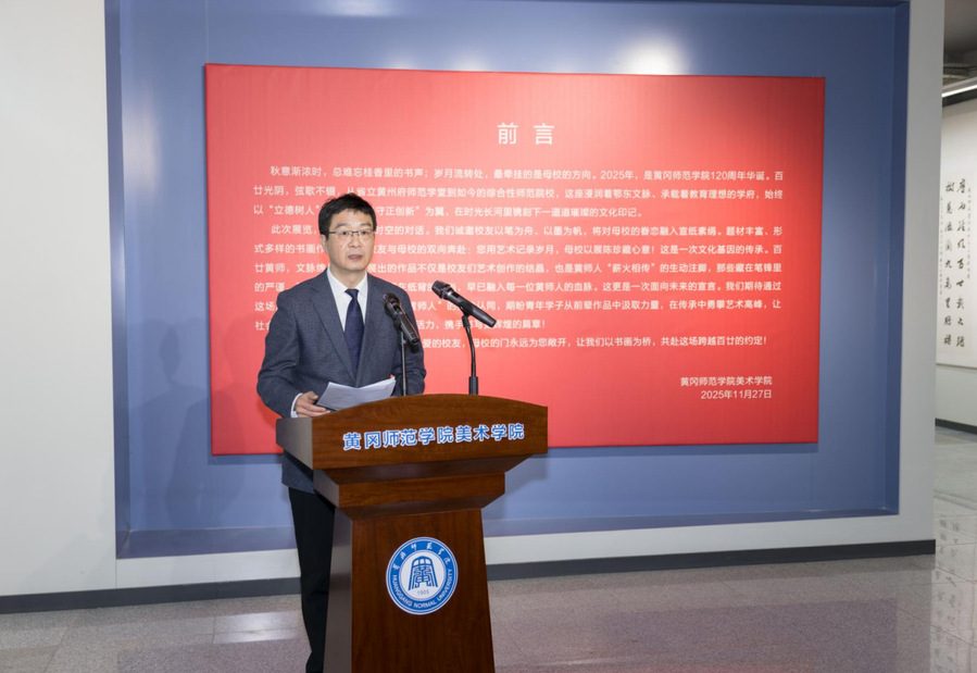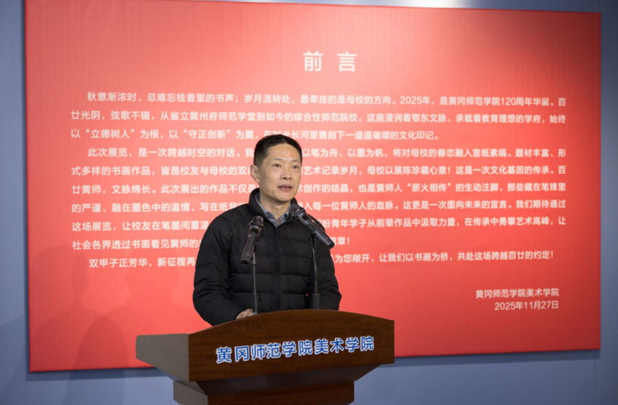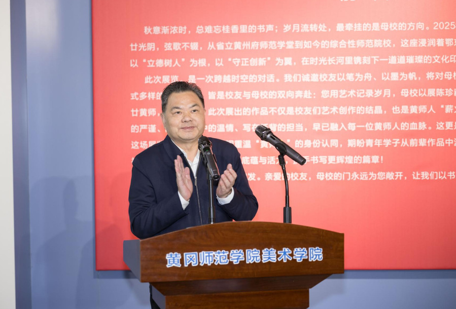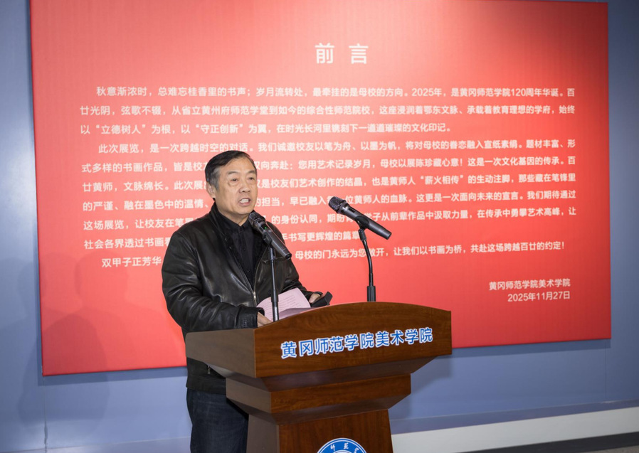 陈向军代表学校致辞并宣布开幕。他代表学校向各位嘉宾、校友和师生表示热烈欢迎!向为本次展览付出辛勤汗水的校友和老师们表示衷心感谢!他指出,在黄冈师范学院喜迎建校120周年之际,举办本次书画展,不仅是一场艺术盛宴,一次校友情感的深度交融,更是以艺术之名向母校生日献上的一份深情厚礼!展出的每一幅生动典雅的作品,既凝聚了校友们的艺术才华,也饱含着大家对母校割舍不断的深厚情愫!展览作品中既有历史回响,也有时代印记;既有传统笔墨的深厚底蕴,又见现代艺术的创新探索。校友们的创作,既是对母校百廿华诞的献礼,也是对教育初心的回溯,生动展现了学校120年的美育传承与创新,意义非同寻常。本次作品展,既为母校120周年华诞增添别样喜庆氛围,也加深了校友们对黄师精神和育人文化的理解传承!