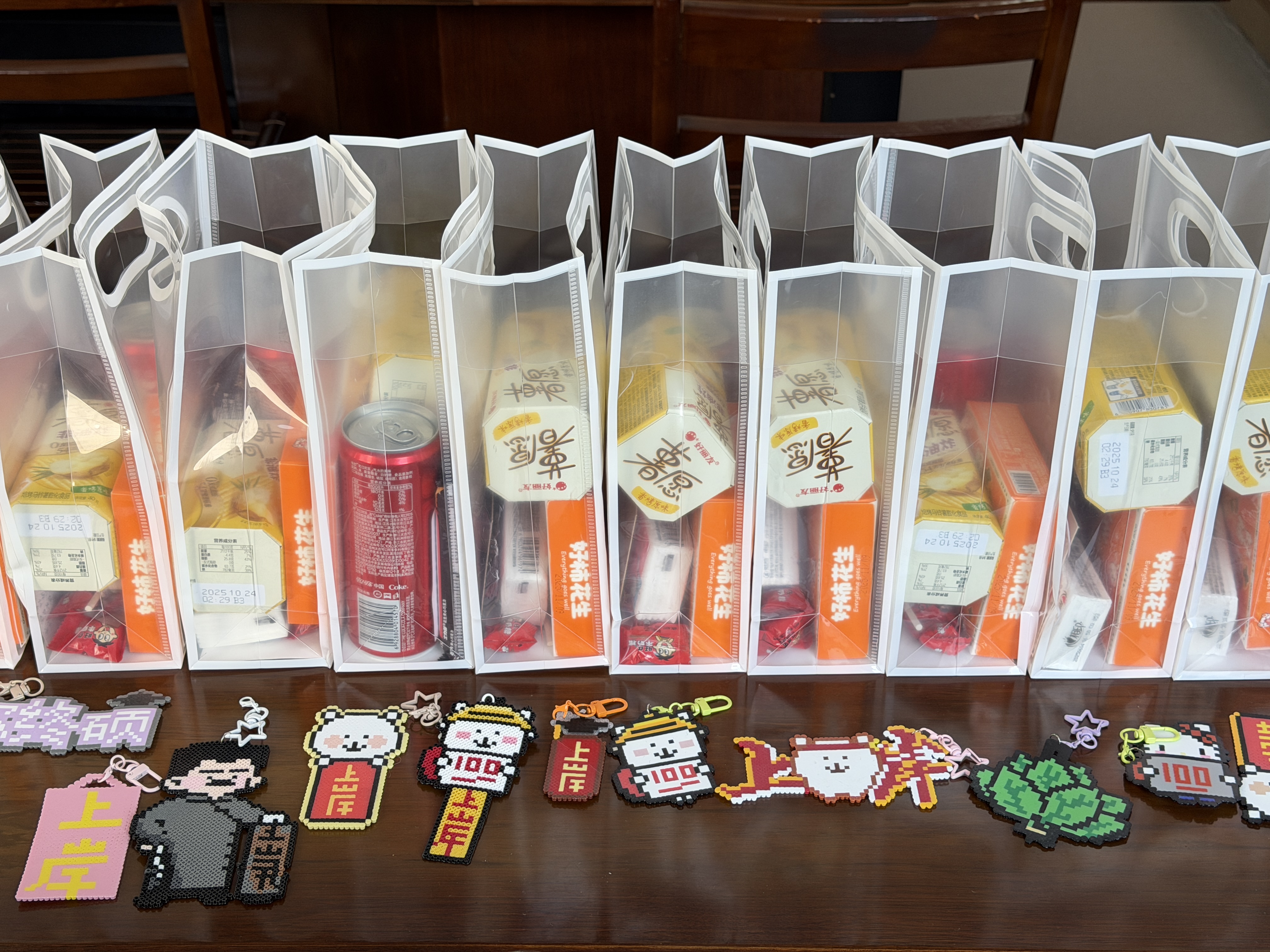随后,一系列精心设计的暖心环节徐徐展开。学院为学子们准备了写满激励寄语的祝福卡片;学弟学妹们结合专业特长,提前制作了“一战成硕”“顺利上岸”等暖色系拼豆手作,不少作品背后还留有亲手写下的祝福;研究生与学弟学妹代表也现场送上鼓励,传递真挚情谊。此外,定制版“考研加油包”也送到每位同学手中,其中“柿柿如意”“好事花生”等礼物既承载美好寓意,也为紧张备考带来实用支持。活动现场始终洋溢着温馨与鼓舞,师生合影留念,一张张年轻面庞凝聚着奔赴考场的坚定与期盼。