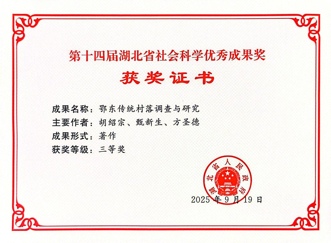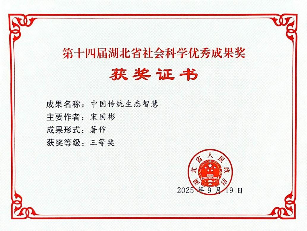 近日,湖北省人民政府正式公布第十四届湖北省社会科学优秀成果奖获奖名单,我院胡绍宗、甄新生、方圣德的著作《鄂东传统村落调查与研究》与宋国彬的著作《中国传统生态智慧》两项成果获评三等奖,获奖数量创历史新高。