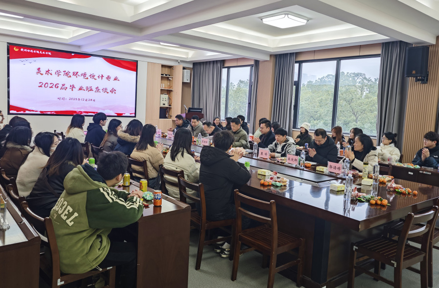 为深入掌握学生动态,精准对接毕业季需求,系统部署关键环节工作,12月24日,美术学院2022级环境设计专业师生座谈会在美术楼A311会议室成功举行。学院院长袁朝辉、党委副书记杨波、副院长舒开智,系主任甄新生、教师代表晏俊、辅导员袁婷、班主任宋次轩、郭汤婷及专业全体学生齐聚一堂,面对面交流。座谈会由袁婷主持。
