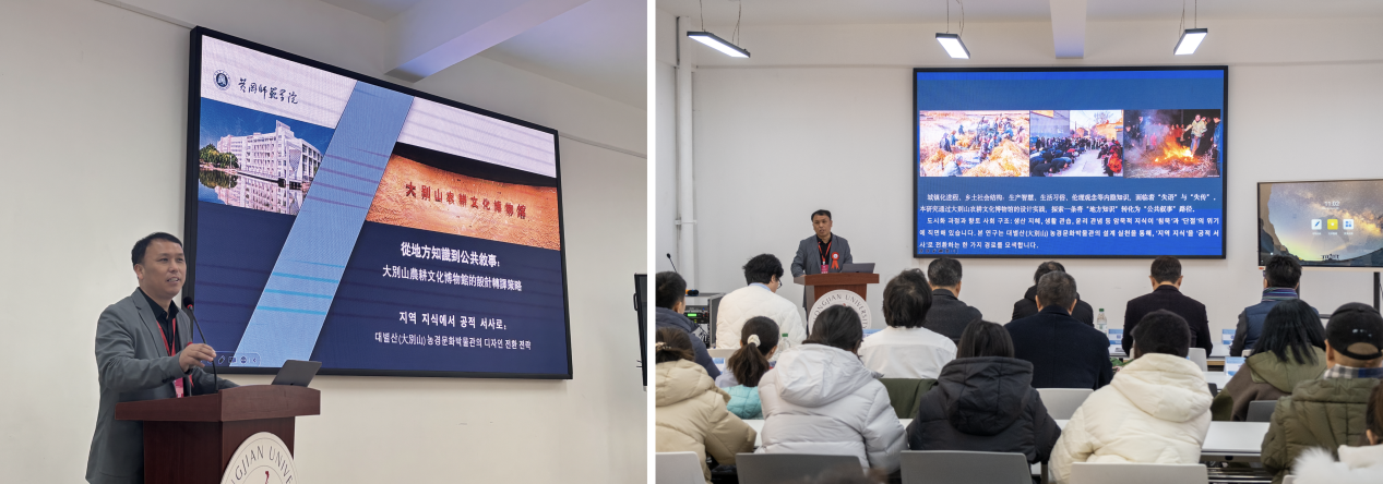 在同期举办的“中韩设计发展学术论坛”中,邵照坡教授做了题为《从地方知识到公共叙事:大别山农耕文化博物馆的设计转译策略》的学术报告,从地域文化活化与叙事空间构建的角度,分享了将地域文化资源转化为公共叙事空间的实践路径,引发与会者的广泛共鸣。