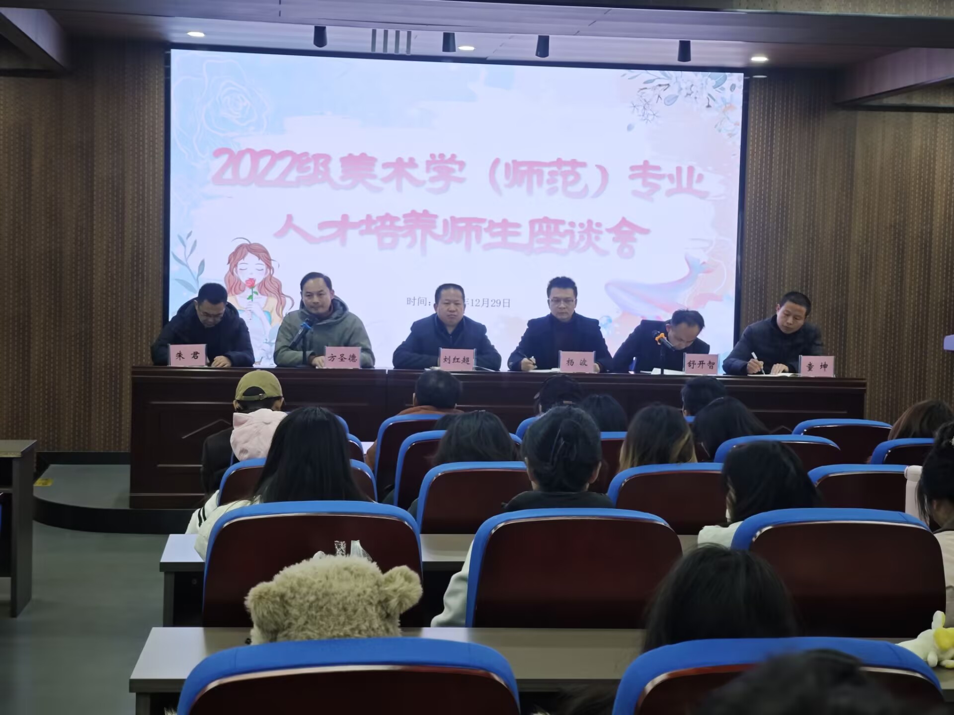 12月29日,美术学院在美术楼A202会议室召开2022级美术学(师范)专业人才培养师生座谈会。本次会议围绕实习研习总结、人才培养方案征求意见、毕业论文(设计)与就业指导四线并进,精准助力学院人才培养方案的修订与完善,为2022级美术学(师范)专业学生顺利毕业和就业提供全面导航。学院党委书记刘红超、党委副书记杨波、副院长方圣德、舒开智,系主任朱君、副主任王雷,美术系教师党支部书记左国华,班主任柯希仑、金鑫及全体美术学(师范)专业学生共同参会,进行了一场务实而深入的交流。座谈会由系主任朱君主持。