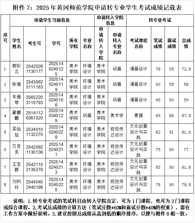 根据学校统一安排,按照《2025年黄冈师范学院美术学院转专业工作方案》,2025年12月29日对我院申请转专业的学生进行了笔试和面试,现将综合成绩公示如下: