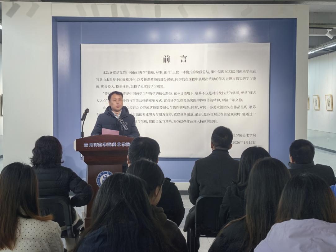 1月13日上午,“传移模写:美术学院写意山水课程教学汇报展”开幕式在闻一多美术馆一楼大厅顺利举行。开幕式由学院副院长舒开智副教授主持。