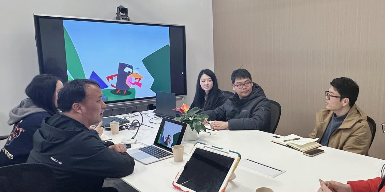 在苏澜士集团数智研究院,邵照坡教授进一步汇报了当前数字教育转型背景下动画人才培养面临的现实挑战,包括课程体系与数智技术迭代的适配性、产教融合、学生实践能力与行业需求衔接等问题。副总裁梅创、人工智能设计总监黄挺喜、数智编导喻子格等结合产业前沿,分享了数智时代对复合型创意人才的需求趋势。