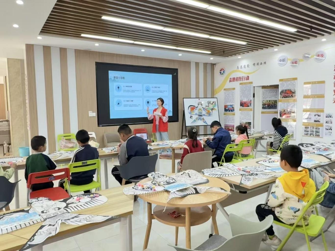 活动现场,师生团队以“纸鸢寄情,非遗风筝”为主题,依托大别山农耕文化博物馆丰富的文化资源,通过现场示范与分组指导,带领社区青少年在传统风筝上进行创意涂鸦。研究生陈颖作为主讲教师参与其中,她感慨道:“走进社区的美育实践让我看到了孩子们天马行空的想象力,那种纯粹的表达让艺术展现出最动人的模样,也让我更深刻地领悟到艺术与生活相融的独特价值。”在一笔一画的色彩流动间,非遗技艺的灵动魅力在指尖跃动,志愿者们用专业知识耐心服务群众,将一只只承载着童心与传统的风筝变为了连接文化传承与现实生活的艺术桥梁。